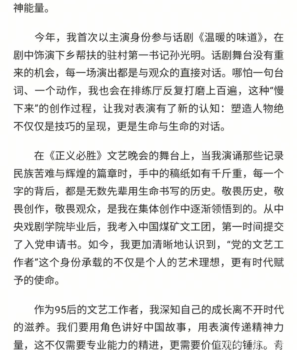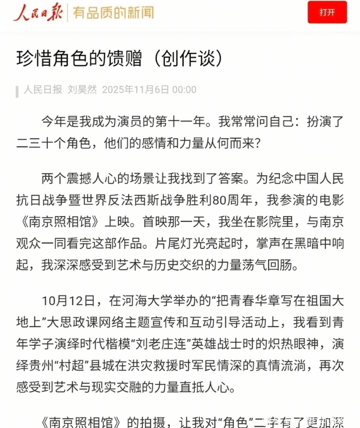 几乎每一年都会给我们带来新的惊喜,最近又解锁了新的身份“人民日报撰稿人”,字里行间流露的全是对新时代青年演员的理解和责任与担当,而这也同样是他从业十多年来的感悟。三重叩问11月6日,刘昊然第二次在人民日报副刊上发表了文章,名为《珍惜角色的馈赠》,
